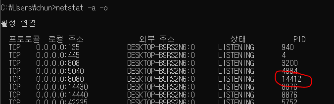 입력 후 8080에 해당되는 pid를 찾는다.