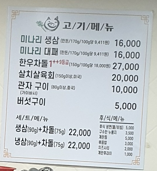 오랜만에 갔더니 미나리 대패삼겹살로 바꼈다. 원래는 그냥 대패삼겹살로 팔았었다. 가격이 올랐는진 몰겠으나 맛은 여전히 있었다. 근데 오늘은 유난히 뼈가 좀 억셌던거 같다.