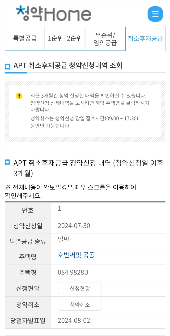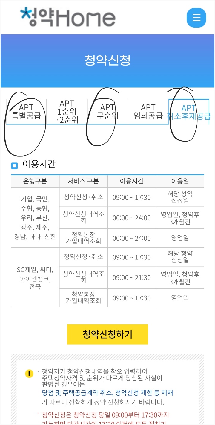 정확히 무엇을 신청할 지 알고해야한다. 특별공급인지 일반공급인지, 취소물량 인지 등(첫번째 사진)