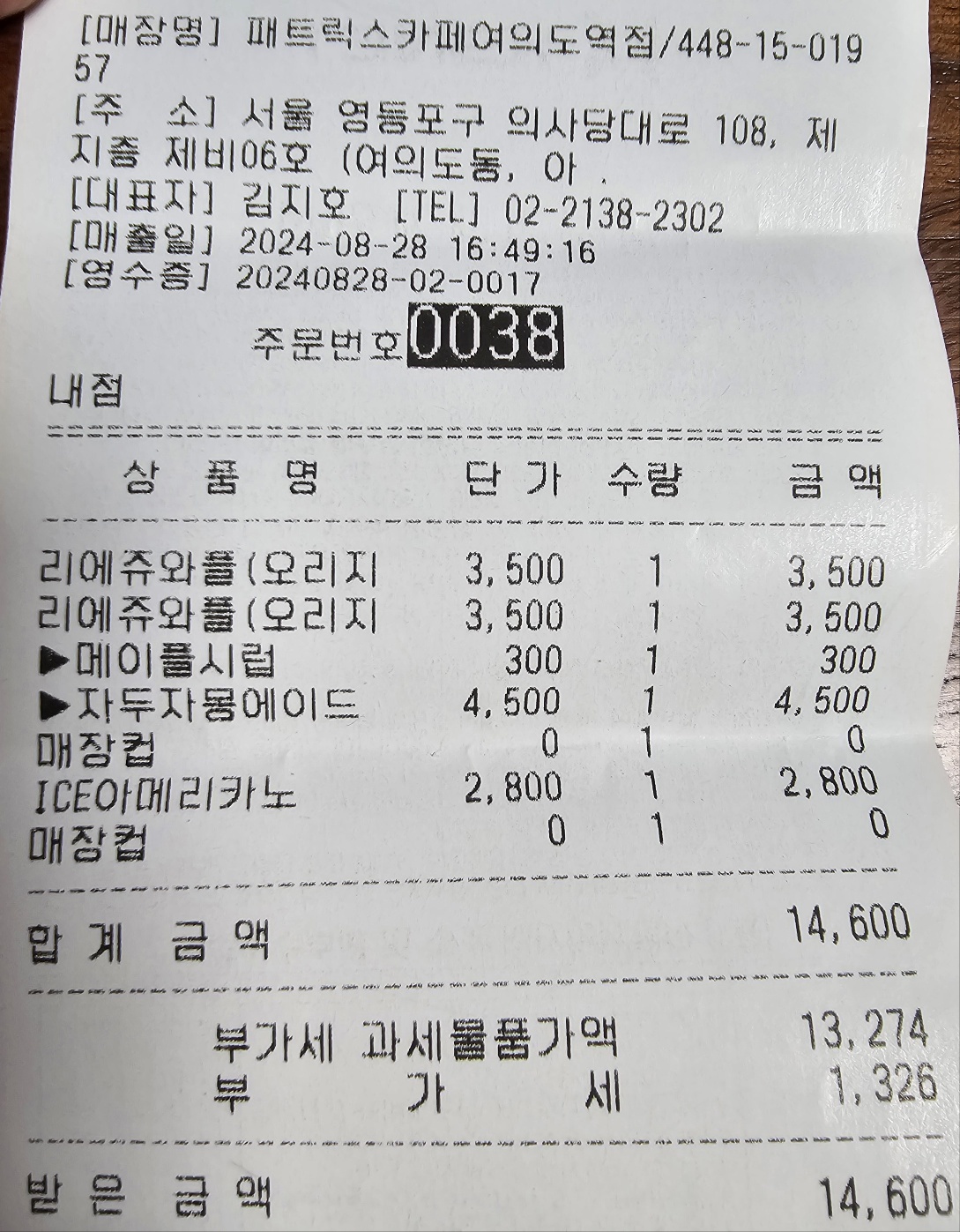 [10초리뷰] 패트릭스카페(플레인 와플, 커피, 여의도)