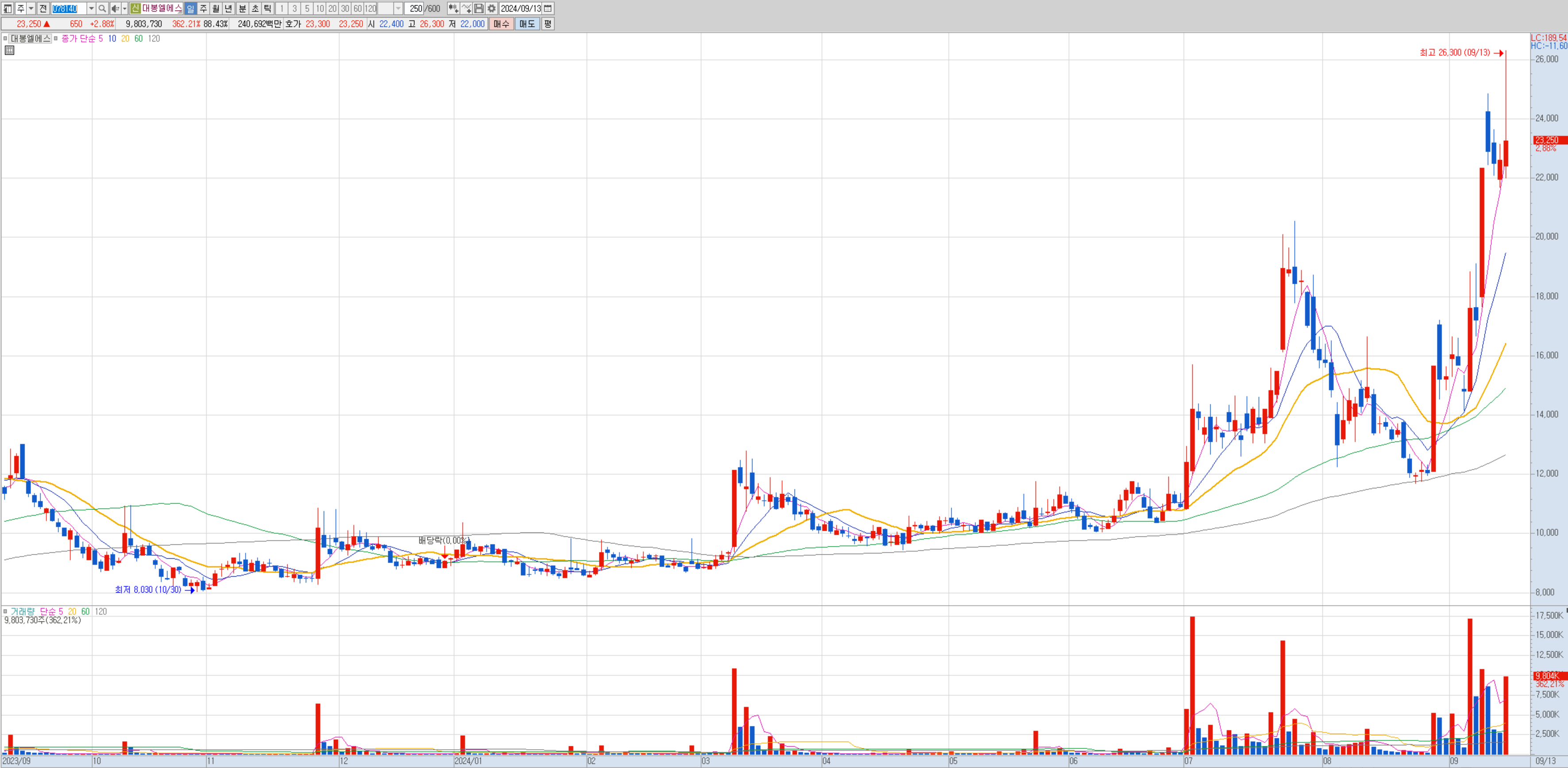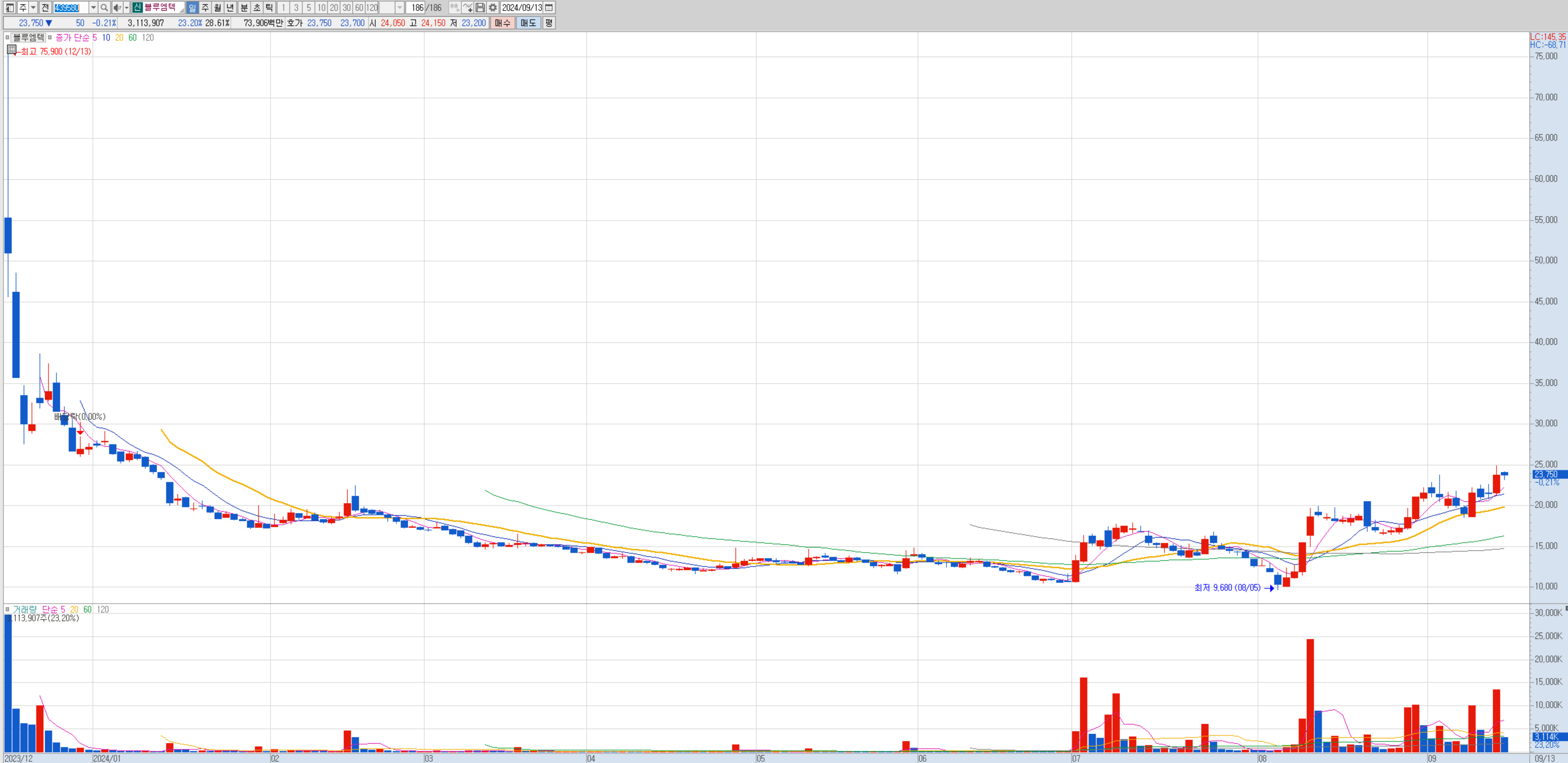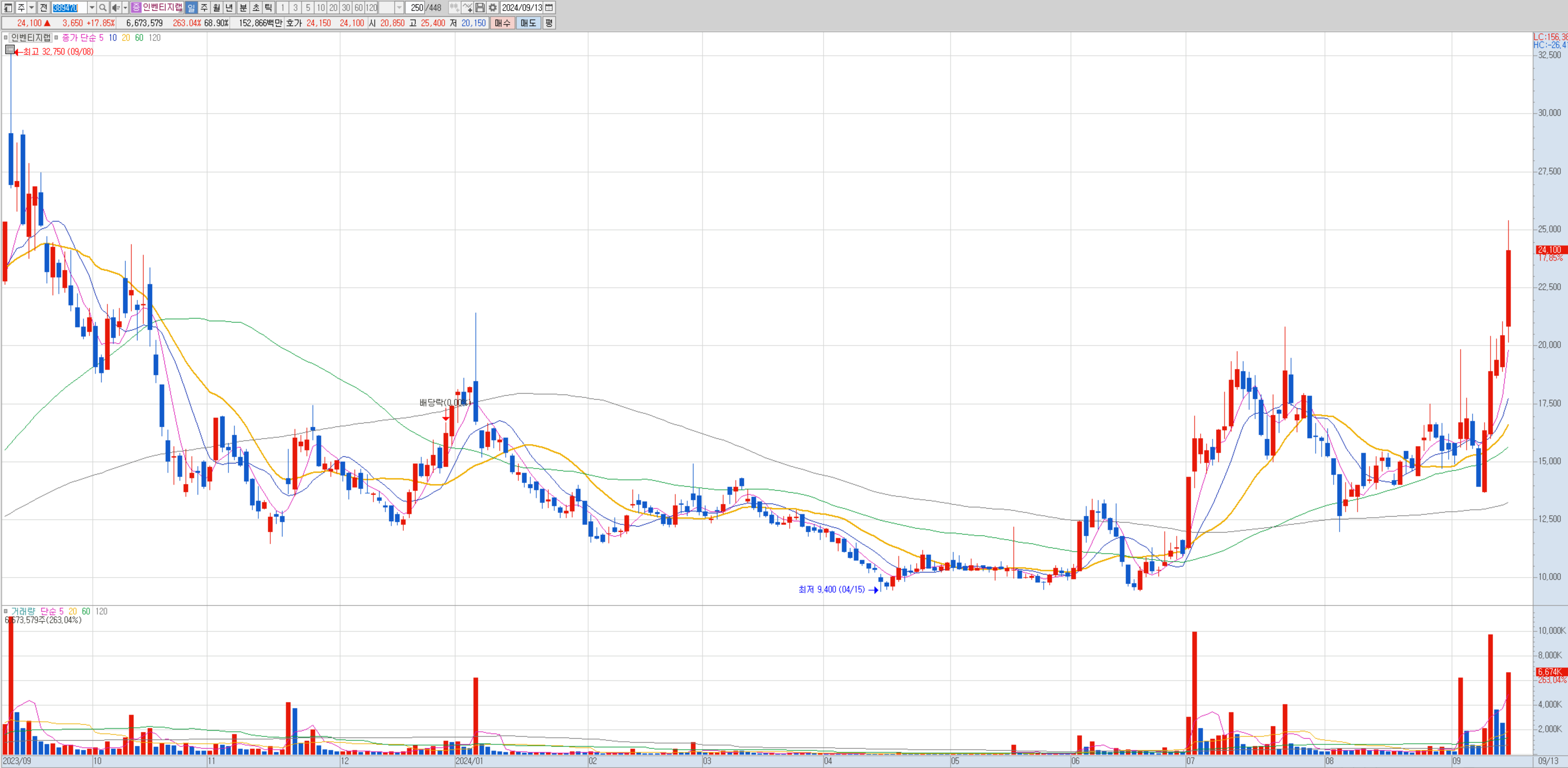 최근에는 대봉엘에스, 블루엠텍, 인벤티지랩이 세 종목이 대장격 역할을 하면서 오르는 거같다.