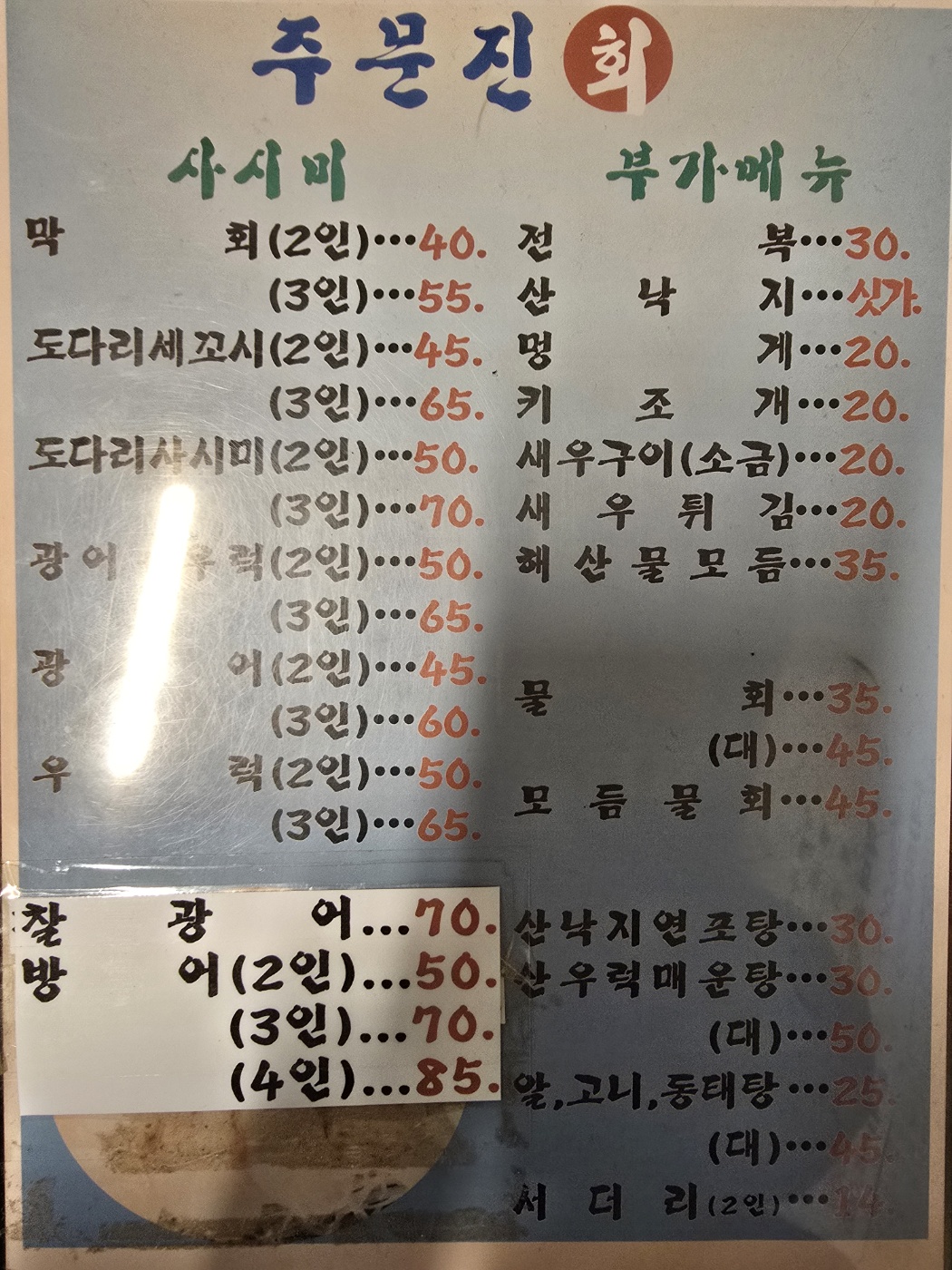 찰광어와 물회가 제일 유명하다고 해서 먹었다.