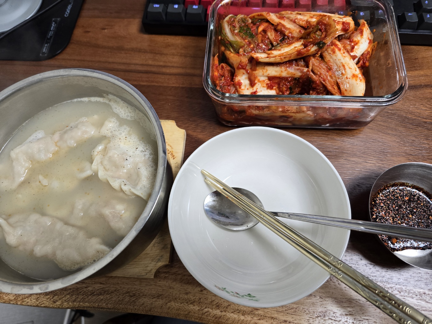 만두국과 김장김치. 사실 김장김친 아니고 속배기랑 무친 김치이다. 굴도 같이 있다.