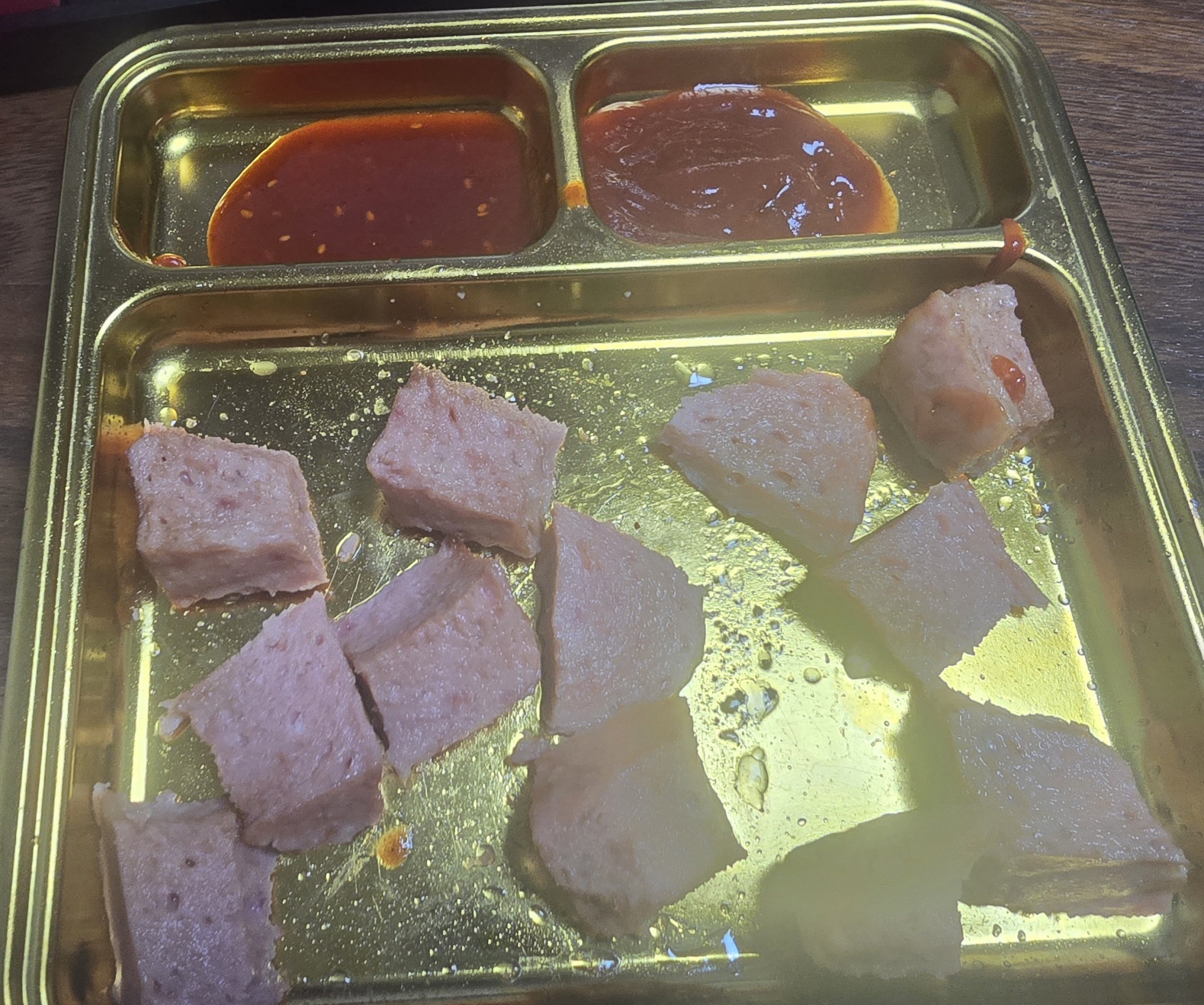 스팸 굽기도 귀찮아서 전자레인지에 뚜껑덮어 돌려 먹었다. 뚜껑안덮으면 난리난다.