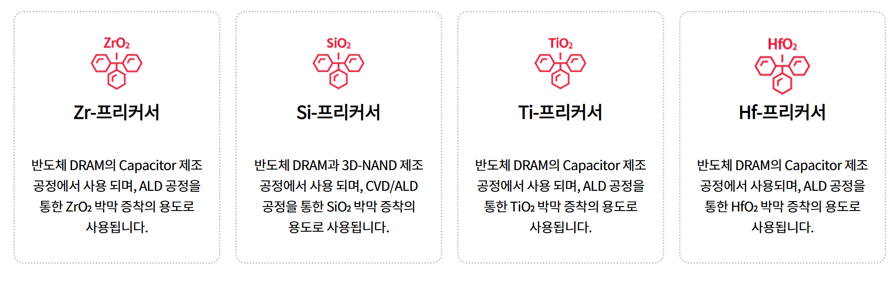 주요 제품: Zr계(CP-Zr), Hf계(HfO₂), Si계(HCDS) 전구체.