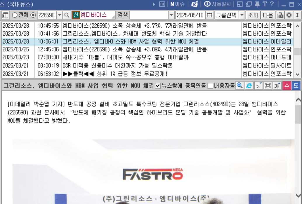 납품 가능성 근거: SK하이닉스는 HBM 적층 단수를 늘리면서 칩 간 간격 축소와 열관리 문제를 해결해야 하는데?blog.naver.com, 마이크로범프 대신 Cu-Cu 직접 접합하는 하이브리드 본딩이 해법으로 주목됩니다?etnews.com. 엠디바이스의 기술은 고다층 적층의 신뢰성을 높이고 신호 전달 개선에 기여할 수 있어, 관련 공정 도입 시 파트너로 선정될 가능성이 높습니다. 특히 동사가 국내 최초로 하이브리드 본딩 기반 HBM 적층 기술을 선보였다는 점에서 SK하이닉스의 조달 다변화 전략과 맞아떨어집니다. SK하이닉스는 HBM 분야에서 국내 소부장 협력을 강화하고 있어?blog.naver.com?blog.naver.com, 혁신 기술 보유 업체인 엠디바이스에 기회를 부여할 것으로 예상됩니다.